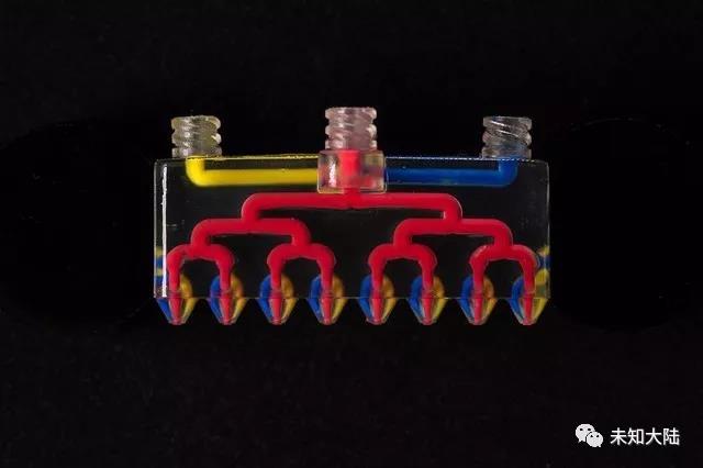 MM3D打印快速切换墨水的关键是打印头内的一系列Y形管道,多个墨水通道在一个输出喷嘴处汇合在一起。喷嘴的形状、打印压力和墨水粘度都经过精确计算和调整,因此,当将压力施加到连接点的其中一个分叉时,向下流的墨水会阻止另一个分叉墨水进入并且向后流动,这可以防止墨水混合并保持打印对象的单一材质。通过使用一排快速气动阀操作打印头,这种单向流动特性可以快速切换每个喷嘴连续流出的多种材料的细丝,并可以构造多种材料符合的零件。论文共同第一作者Jochen Mueller博士说:“借助MM3D技术,人们可以使用特性随时间变化的反应性材料,例如环氧树脂、硅树脂、聚氨酯或生物墨水,还可以轻松地将不同特性的材料集成在一起,以创建类似折纸一样的结构或兼具刚性与柔性部件的软机器人。
