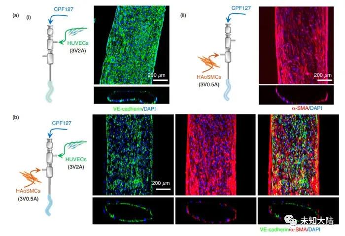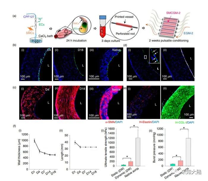 内皮细胞和平滑肌组织的定位对于移植物起作用至关重要。正如论文作者所解释的,他们指出:“要生产具有正常血管功能的移植物,必须实现两种关键成分的重建,即:(1)融合的静态内皮细胞具有非血栓形成界面,可抑制血栓形成,和( 2)收缩性平滑肌组织可以承受血流动力学压力,表现出生理顺应性,并通过收缩和放松适应局部血压的变化。”