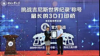 7月21日,河北工业大学装配式混凝土3D打印赵州桥,成功挑战吉尼斯世界纪录,获“最长的3D打印桥”认证。吉尼斯认证官吴晓红女士为记录创造者、该校马国伟教授团队颁发认证证书。