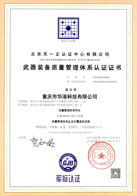 2024年3月20日,华港科技顺利通过军工产品质量管理体系认证(简称“国军标”),获得北京天一正认证中心有限公司颁发的《武器装备质量管理体系认证证书》。