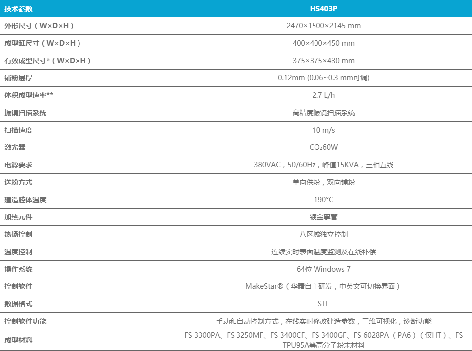 HT403P是华港科技第二款可以烧结熔点在225℃以下的材料的设备,在国际上具有领先水平。配合华港科技与全球最大的化工集团德国巴斯夫共同研发的纯PA6 3D打印材料FS6028PA,组合成目前市场上唯一既具备大尺寸成型能力,又能烧结PA6材料的3D打印解决方案。与前一代402P系列相比,403P系列成型缸由400×400×450增大至400×400×600(高缸为选配),满足了多数客户更大尺寸工件生产的问题,免去工件拼接的麻烦。新型动态热场温控系统,稳定了动态温度、热场监测、热源补偿,优化密封及传感,不但保证了打印制件的高性能,而且保证了不同批次制件的强度、尺寸精度、热变形等多项性能。与402P系列相比,403P系列扫描速度由最高的12.7m/s提升为最快15.2m/s,层厚提升20%至0.12mm,铺粉速度提至280mm/s,成型速率提至4.0l/h,进一步提升了403P系列的高品质。与打印精度一起革新的,还有更智能的系统软件。403P系列秉承华港科技开源理念,推出了Make Star P新一代开源软件,支持实时在线添加或删除工件,其操作系统为64位的Windows 7,使设备性能升级空间更大,能提升操作灵活性及设备性能,并为用户提供持续的免费升级服务。